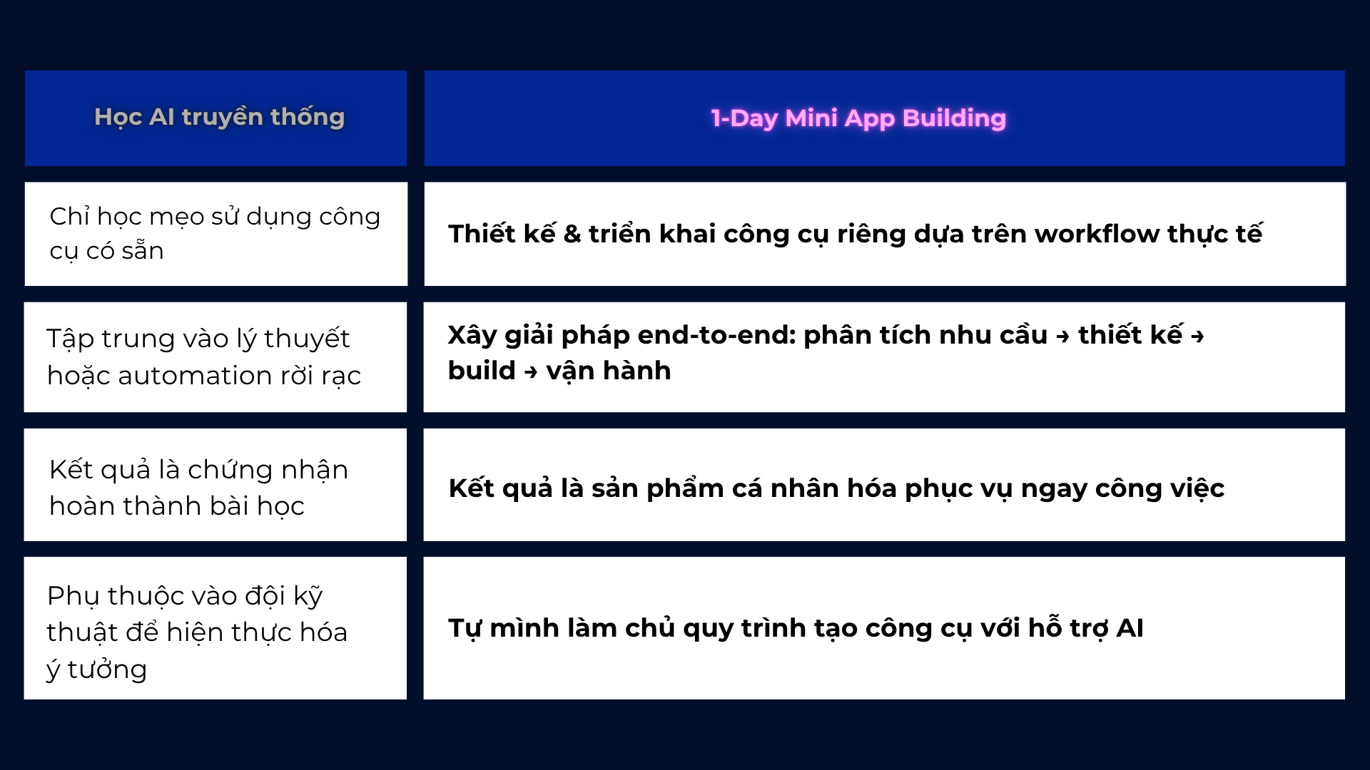 1-Day Mini App Building là chương trình giúp bạn tự tạo mini-app của riêng mình, không phải là một “chatbot thông minh”, mà là ứng dụng thật có giao diện, dữ liệu và logic hoạt động như các app ngoài thị trường.